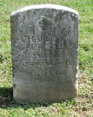 Private Charles J. Burckle, 27, of Louisville, Jefferson County, was seriously wounded in action in France on 7 August 1918 while serving with Battery A of the 146th Field Artillery, 41st Division. Burckle died of his wounds on 8 August 1918.