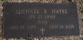 Specialist Michael Ray Hayes, 29, of Morgantown, Butler County, Kentucky, was killed on 14 June 2005 near Baghdad, Iraq when insurgents fired on their armored Humvee with a rocket-propelled grenade. Hayes was on federal active duty with the Bowling Green detachment of the 617th Military Police Company. Hayes' Humvee was fully equipped with armor plate and bulletproof glass, and Hayes was wearing a Kevlar vest.